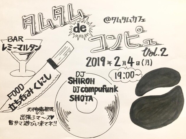 前回好評だった『タムタムdeコンピュ』第2弾!今回も…「天神橋界隈から出張しまーす。皆様遊びに来てくださいませ〜◎」Compufunk に行った事ある人もない人も、立ち呑みくにしに行った事ある人もない人も是非覗きに来て下さーい♫