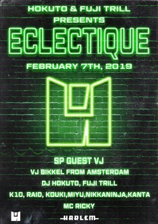 DJ HOKUTOが5年に渡り毎年2回のヨーロッパツアーを敢行する中で、アムステルダムで出会った今までのDJの常識を覆すDJスタイル“Eclectic”。そして、音楽のメッカヨーロッパで毎夜繰り広げられる、自由な音楽感と遊びのスタイルに衝撃を受け、そのパーティ感とDJスタイル再現するパーティとしてスタートしたのが『ECLECTIQUE』。