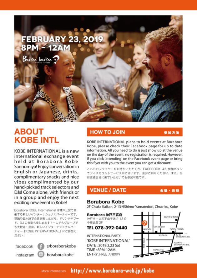 Borabora KOBE International は神戸三宮で開 催する新しいインターナショナルパーティーです。 英語や日本語で会話を楽しんだり、ドリンクやフー ド、DJ の音楽も楽しめます!一人でもグループでも大歓迎!是非、新しいインターナショナルパーティー「KOBE INTERNATIONAL」にご参加ください!