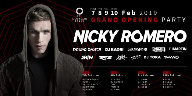 2月7日(木)から2月10日(日)までの4日間は、グランドオープニングパーティとしてスペシャルラインナップで営業。2月7日(木)には、NICKY ROMEROが出演する。