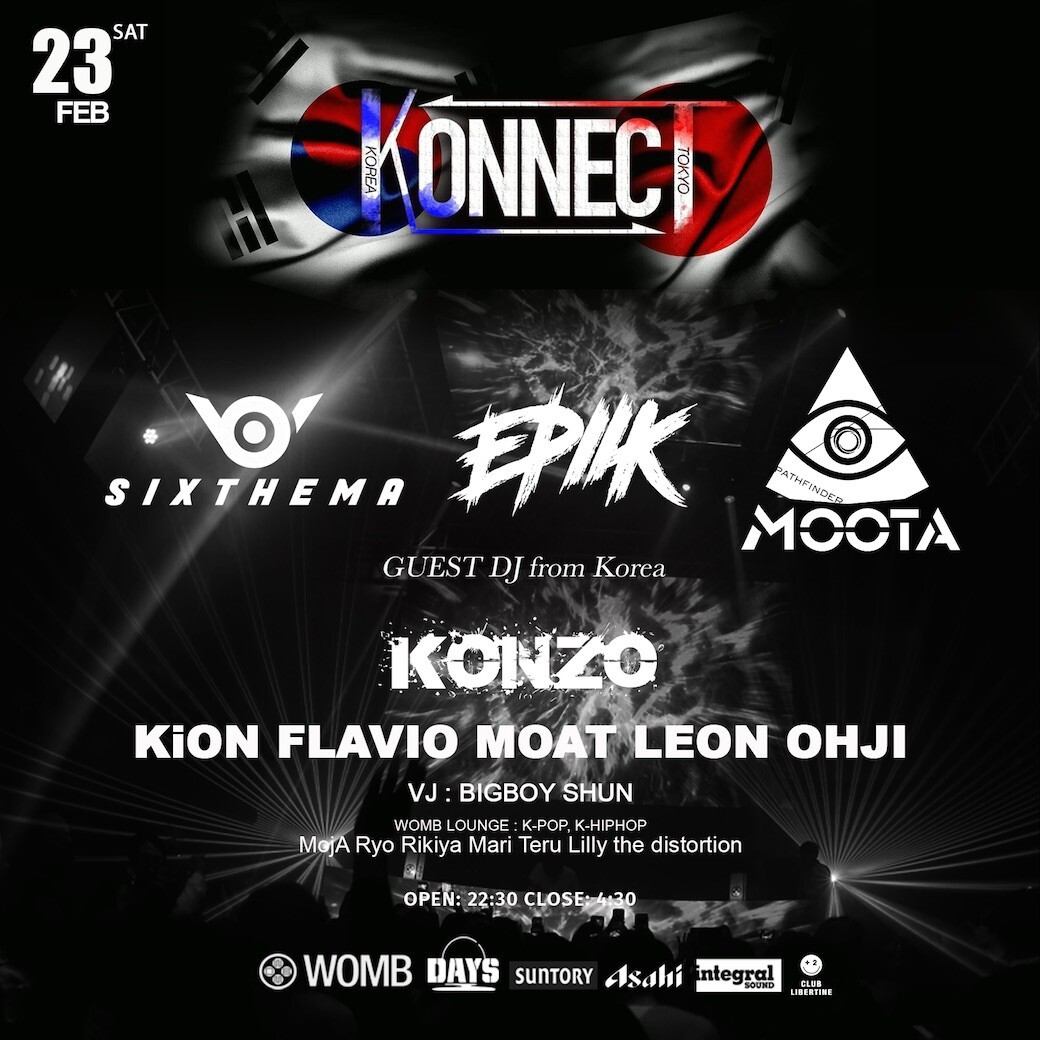 今回のゲスト1組目は前回物凄い人気だった EPIIK が再来日!そして、EPIIK と共に DISCO を作曲し様々な作曲、編曲を手掛ける有名プロデューサー SIXTHEMA も共に来日し、2人のコラボステージとなる! そして2組目は韓国 Gwangju から Club libertine のレジデント DJ MOOTA が登場! 韓国の様々なクラブでの長い経歴と実力は圧倒的です。当日の彼のプレイをお見逃しなく! また、WOMB LOUNGE には毎回お馴染み K-POP に加え K-HIP HOP タイムも加わり更なるパワーアップ! 全フロアで韓国の音楽を体感できます。