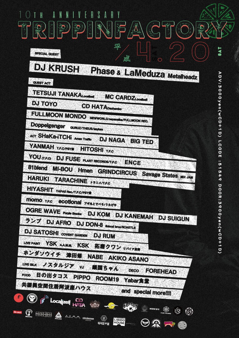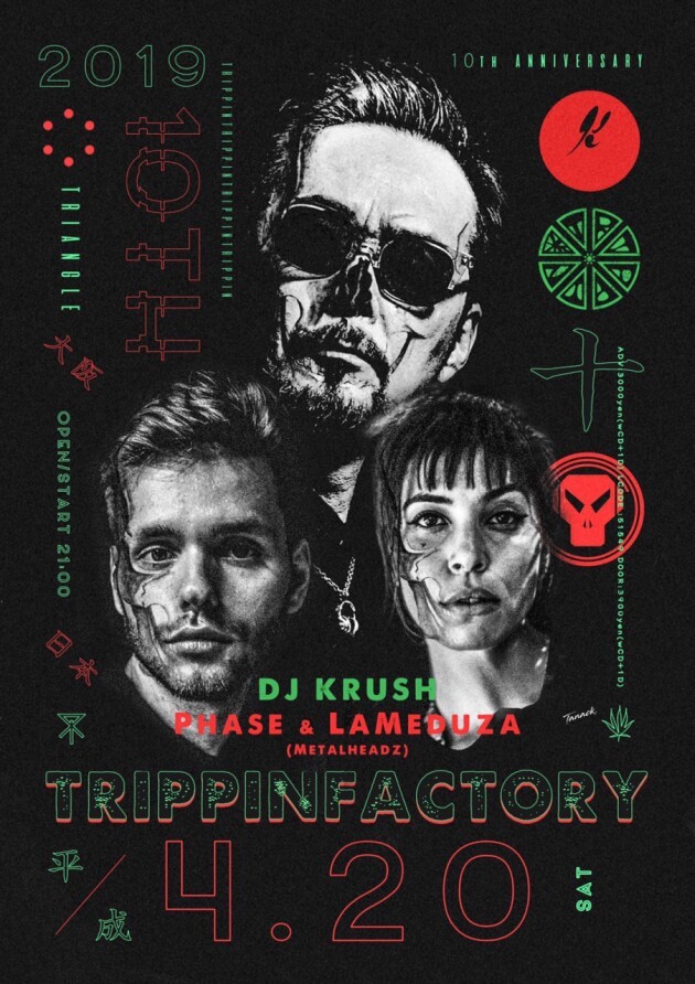 4.20(SAT)アメ村TRIANGLEにて DJ KRUSH、Phase & LaMeduza筆頭に錚々たるLINE UPで開催!! TRIPPIN FACTORY 10th ANNIVERSARY!!
