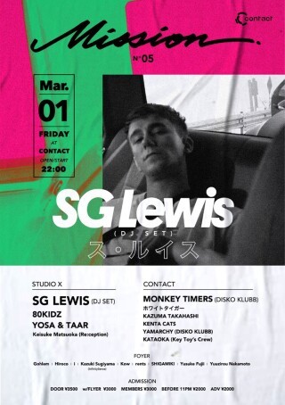 幅広く自由な意識でダンスミュージックとポップカルチャーにアプローチしてきた80Kidzが、もっともその音楽性を発揮するパーティーがMission。5回目の開催となる今回のMissionがゲストに迎えるのは、イギリス、リバプールの成長株SG LEWISだ。Julio Bashmore、Jassie Ware、Disclosureといった才能をいち早く世に送り出した人気レーベルPMRからのリリースを皮切りに、SG LEWISはハウスの影響を落とし込んだポップ性を独自に確立し、メジャーレーベルとの契約を勝ち取るまでに成長。トラックに宿る重厚なエモーションと焦がれるソウルを表現するボーカリストをフィーチャーし、音楽性をさらに拡張していこうとしているいま、今回のMissionへの出演は目下躍進中の才能をその身で体験する絶好のチャンスだ。さらにこの出演ではContactという場所を意識して、SG LEWISのインスピレーションを受けている音楽やパーソナルなテイストが色濃く打ち出される予定だ。