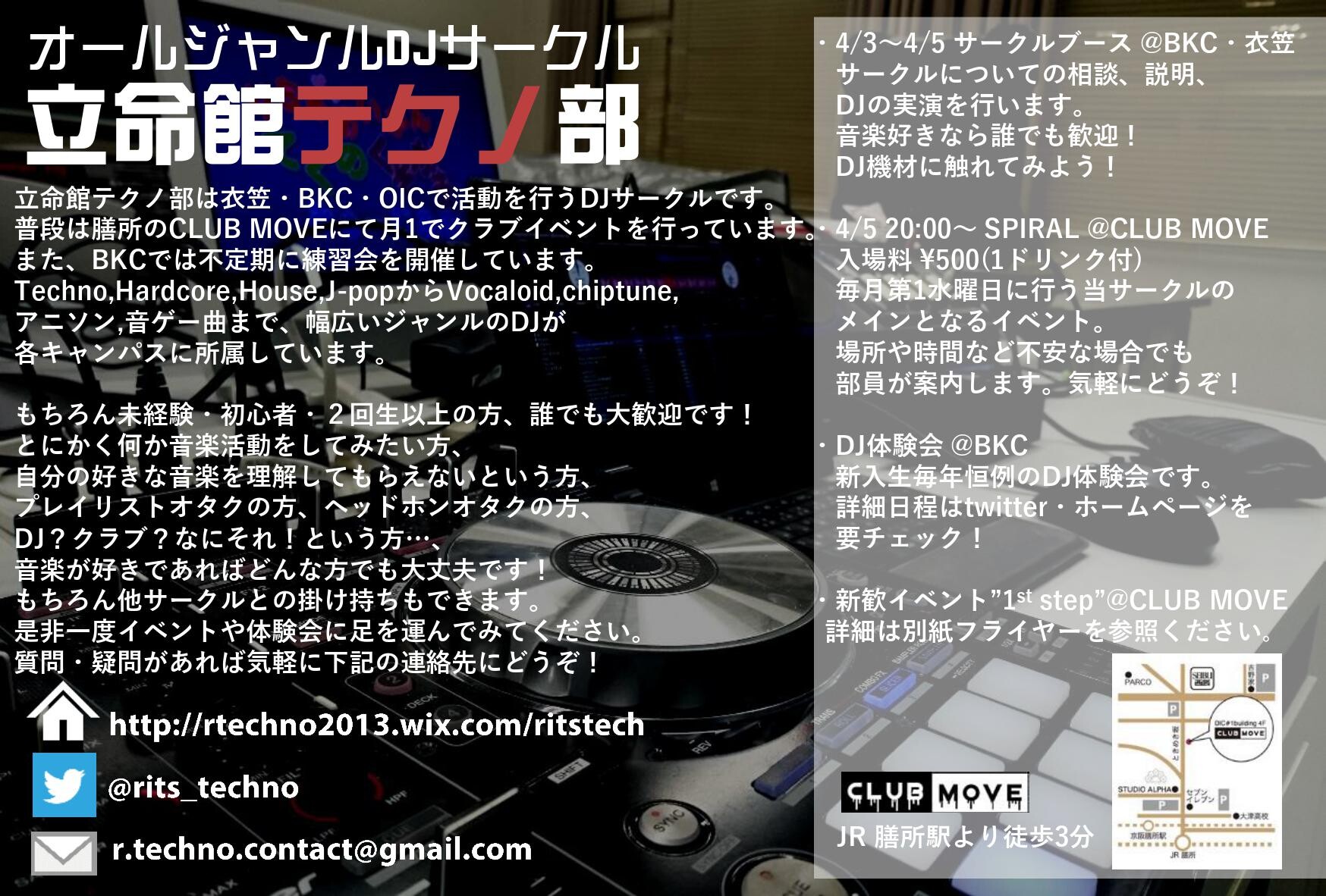 立命館テクノ部による10年以上続く老舗イベント "SPIRAL" は普段通りのテクノハウスに始まり、普段のMOVEでは聞けないアニソンやハードコアまでジャンルの垣根を超えて多くの音楽を聞いていただけるイベントです!新たなジャンルの開拓はもちろん、現役大学生との交流、クラブデビューまで非常に柔軟性の高いイベントです!