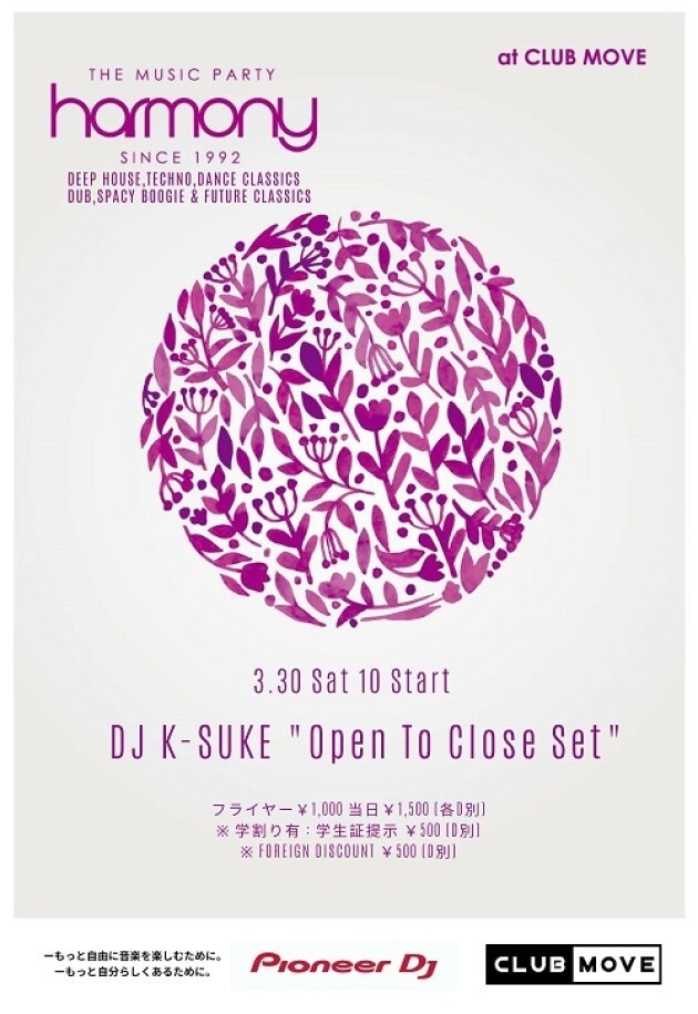 滋賀県大津市生まれ。CLUB MOVEオーナー/ DJ。1986年頃より、藤原ヒロシ氏とRUN DMCに衝撃を受けDJ活動を開始、その後RARE GROOVE、UK BREAK BEATS、HOUSE、GARAGE等の影響を経て、80年代後半よりHOUSE DJとして、当時KYOTO JAZZ MASSIVEの沖野修也氏が店長を務めていた京都のCLUB CONTAINERを中心に大阪、滋賀等でも幅広く活動する。95年CLUB MOVEの前身となる「 T-UP BAR 」を地元大津でオープン、97年滋賀初の本格的クラブ「 CLUB MOVE 」をオープンする。92年よりスタートした自身がオーガナイズするMUSIC PARTY「HARMONY 」(現在CLUB MOVEにて毎月最終土曜日に開催) は、今年で27年目を迎え、多彩なゲスト陣のPLAYはもちろん、K-SUKE自身のOPEN MINDなルーツから繰りだされるNYダンスミュージックスピリットを受け継ぐジャンルを越えたGOOD MUSICを自在にMIXするスタイルが、多くのクラウドを惹きつけ続けている。2019年でDJ33周年を迎え現在はCLUB MOVEの経営の傍ら、大阪、京都を中心に数多くのPARTYにゲストDJとしても出演、MOVEオーナーとしてだけでなくDJとしての活動も精力的に行っている。