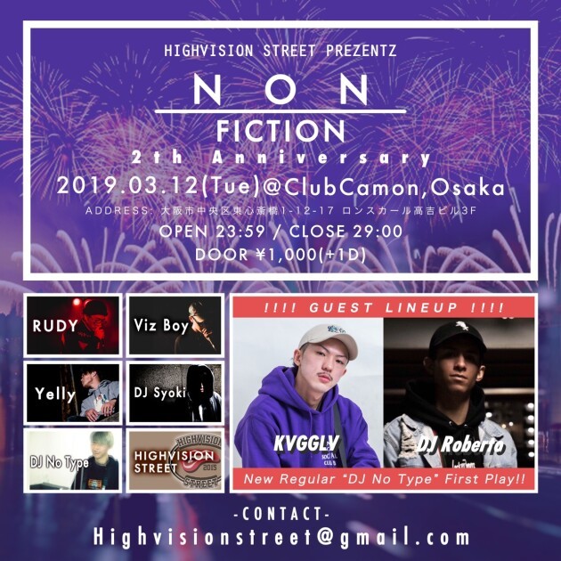 【NON-FICTION】3/12(火)☆毎月第2火曜開催HIGHVISION STREET presents『ノンフィク』2周年祭☆☆GUEST LINE UPにKVGGLV、DJ Robertoが登場★★