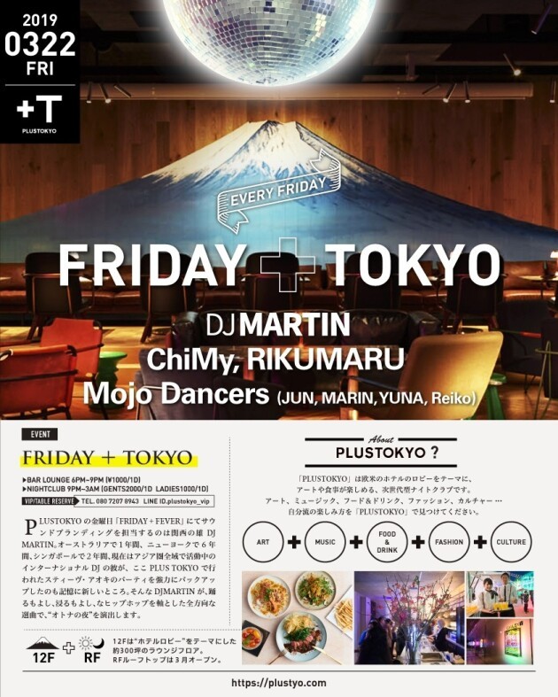 PLUSTOKYOの金曜日「FRIDAY + FEVER」にてサウンドブランディングを担当するのは関西の雄DJ MARTIN。オーストラリアで1年間、ニューヨークで6年間、シンガポールで2年間、現在はアジア圏全域で活動中のインターナショナルDJの彼が、ここPLUSTOKYOで行われたスティーヴ・アオキのパーティを強力にバックアップしたのも記憶に新しいところ。そんなDJ MARTINに加えて、PLUSTOKYOの金曜日をフィーバーさせるのがイラストレーターとしても活躍中のレジデントDJ、ChiMy。この要注目の二人が、踊るもよし、浸るもよし、なヒップホップを軸とした全方向な選曲で、“オトナの夜”を演出します。