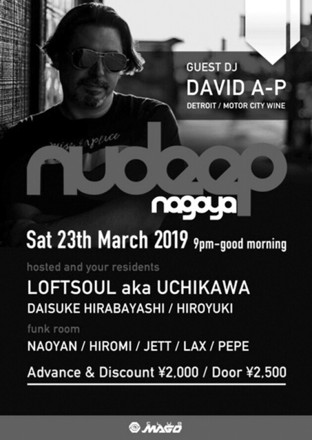 デトロイトで最もDJから支持されているMoter City WineのオーナーでもあるDavidA-Pを迎えてのスペシャルナイト。NUDEEPは国内のDEEP&SOULFULなHOUSEシーンを牽引するパーティーです。メンバーは国際的に活躍するLOFTSOUL aka MASAHIKO UCHIKAWAがメインDJを務める他、若手有望株なHIROYUKI、NAOYAN。個性的な女性DJのHIROMI、若きオーガナイザー・DAISUKE BAYASHIなど名古屋アンダーグラウンドDJが名を連ねます。最新のHOUSEからクラシクスまでハイクォリティなDJセンスと独自のコネクションから招聘するユニークなゲストに常に音楽好きやダンサーなどのパーティーシーンでは話題です。更に2017年よりレーベルNUDEEPをスタート予定!!乞うご期待ください。