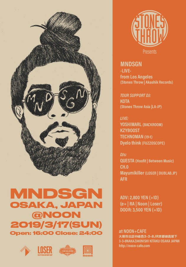 Stones Throw has been throwing smash parties in Osaka for many years featuring Tuxedo, Madlib, J.Rocc, Peanut Butter Wolf, Knxwledge, DaM-FunK and more. This Mar 17th (Sun), the label will host MNDSGN (pronounced "Mind Design"), a favorite amongst Stones Throw's new generation of acts. He will play a special solo live showcase featuring beats + keys + vocal. Known for blending a unique mix of hip hop beats, R&B, modern funk, boogie and soul music, his full-length album 'Body Wash,' was selected by Pitchfork (US media) as one of 2016's best electronic albums. You can also preview his most recent beat tape album 'Snax' ahead of the show. Stones Throw’s label manager for Asia, KOTA, will also have a support DJ set as well as local live artists/DJs from Osaka & Kyoto. 4pm – midnight Sunday evening event with food booths and also pop-up shop by Stones Throw and Loser.