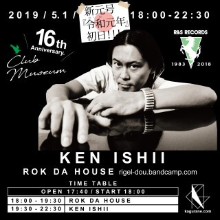 Club Museum 16周年公演となる5/1(祝日/新元号初日)、そしてR&S 35周年シリーズを締めくくるのは、1993年に1stミニアルバム『ガーデン・オン・ザ・パーム』(R&S)でNME誌テクノチャートNo.1を獲得、『プネウマ』で世界を震撼させ、初めて日本産テクノを海外に知らしめた"東洋のテクノ・ゴッド"ケン・イシイによる3時間DJセット!
