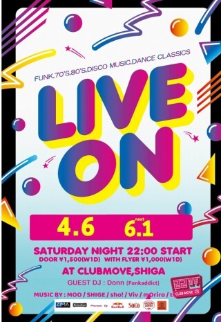 ~LIVE ON~はファンクを中心にソウルやダンスクラシックスなどの70年、80年代のブラックミュージックの土臭く泥臭い本質をさらに追求する内容に!MOVEでお馴染みの出演者 & レギュラー出演者の中でも特にブラックミュージックを愛するメンバー達が集結。メンバーが自信を持って「踊れる選曲」をPLAY!!ファンキー & レアなグルーブはフロアーに至福の時間をもたらします!