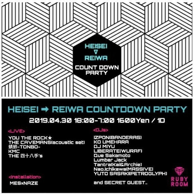平成から令和へと時代が変わる夜。RUBYROOMではCOUNT DOWN PARTYを開催! 平成のHIP HOPシーンを代表する”YOU THE ROCK★”をはじめ、IZPON(BANDERAS) THE CAVEMANS等、RUBYROOMに馴染みの深い豪華出演者が共演する