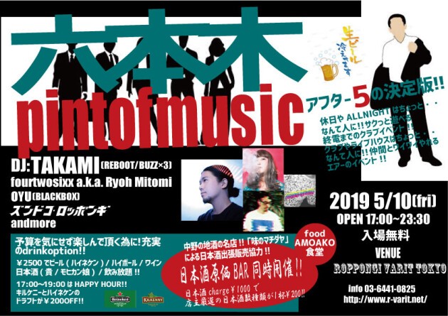 にて新たに立ち上げたあくまで終電まで盛り上がれるparty 「六本木pint of music」いわゆる音楽箱が減ってきている六本木にて、テクノ,ハウスの枠に収まらず、