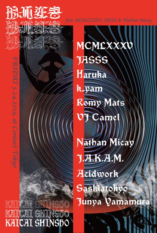 Romy MatsとVJ Camelが中心となって展開する“解体新書”は、世界中の多様な電子音楽を独自の観点でキュレーションするパーティだ。今回は、ベルリンはTresorで開催され、今や国際的なゲイとクィアのコミュニティとしてのみならず、世界中のテクノヘッズや腕利きのDJとアーティストが集まり、一際熱狂的な盛り上がりを見せているパーティHerrensaunaからレジデントDJのMCMLXXXVが登場。そしてローカルゲストに、これまでHerrensaunaに3度出演しているFuture TerrorのHarukaを迎えることで、その圧倒的な熱気の一端を少しでも多くStudio Xのフロアに注ぎ込んでいく。同フロアの音楽的な多様性と折衷性を助長するのは、インダストリアル・エレクトロやIDMにおける老舗〈Mannequin〉や、実験的な電子音楽における北欧の古豪〈iDEAL〉から快作を次々と発表している注目の新鋭、Jasss。作品に通ずる硬質な電子音楽に、彼女のルーツにあるアフロ/ラテンの生音を織り交ぜていくDJスタイルは必見である。Contactフロアには、2018年の〈Whities〉や〈ESP Institute〉からの傑作EPに続き、5月に〈LuckyMe〉から待望の1stアルバムをリリースしたNathan Micay (f.k.a Bwana) が登場する。こちらもまた、新旧問わずトライバルなビートからレイヴトラックまでをブレンドするDJが最大の魅力である。またRomy Matsが親交深める韓国・ソウルのシーンからは、現地で注目の若手として躍動するDJ/トラックメイカーのAcidworkもラインナップしている。
