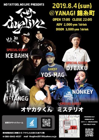 下町THUGLIVEvol.1はMC漢を迎えて豪華ゲスト陣でお送りしました!!vol.2も豪華なラインナップでエンターテイメント性を増したTHUG LIVEを様々な演出でお届けします。 このチケットはALL TIME入場可能 8月4日13時00分〜17時00分〜22時00分