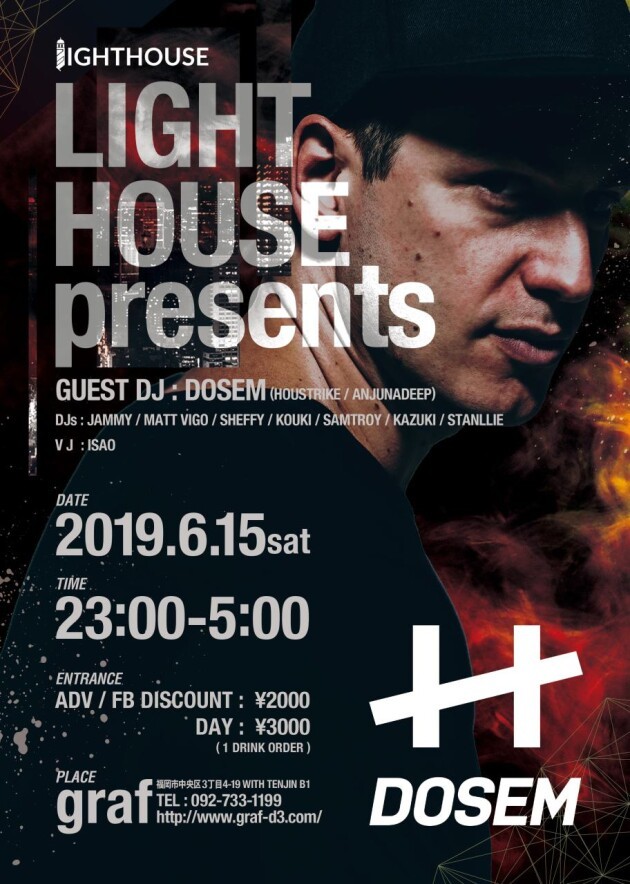 6月15日(土)は福岡にて立ち上げられた話題のhouse musicパーティー、 LIGHTHOUSEによるダンスミュージック界において かかせない貴重な存在であるDJ、”DOSEM” の来福公演が決定!!!