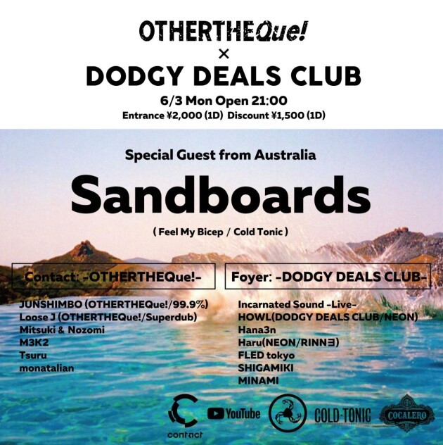 Sandboards, an upcoming house music artist backed up by Bicep〈Feel My Bicep〉and Krystal Klear〈Cold Tonic〉, makes his Japan debut for this special Monday night by OTHERTHEQue! × DODGY DEALS CLUB.