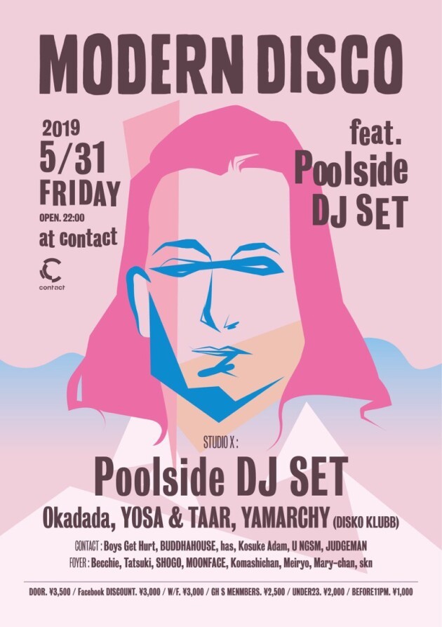 これまでにBondaxやMoon Bootsといった初来日の新鋭から、DJ Falcon、Darius、Dimitri From Paris、Jesse Roseといった名だたるアーティストを招聘し、新世代によるディスコを提唱してきたModern Discoに、今回のゲストPoolsideが初来日を飾るのは必然とも言える。2010年「Do You Believe?」がYouTubeで話題となり、LCD SoundsystemのJames MurphyやレジェンドDerrick May、ディスコのボスTodd Terje等の著名DJも彼のトラックをレコードボックスに加えている。ハッピーかつリラックスムードなディスコサウンドを追求し、ニューディスコ/ソフトロック/AOR/クロスオーバー/フュージョンなどを、卓越したセンスで昇華したそのサウンドは、デイタイムディスコと称され、インディーダンスからロックリスナーまで幅広いファンを持つ。Studio XのサポートにDJ達からの評価も高いokadadaを迎え、Modern Discoの仕掛け人、YOSAとTAARが東京に新たなムーブメントを巻き起こす。