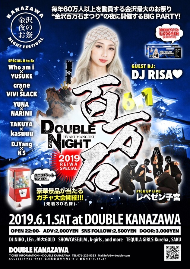 60万人以上を動員する金沢最大のお祭り“金沢百万石まつり”の夜に祭りのメイン通りとなる香林坊付近に位置するDOUBLE金沢にて、毎年満員御礼!凄まじい物凄い盛り上がりをみせる、金沢夜のお祭り“百万石NIGHT!”が今年も開催決定!