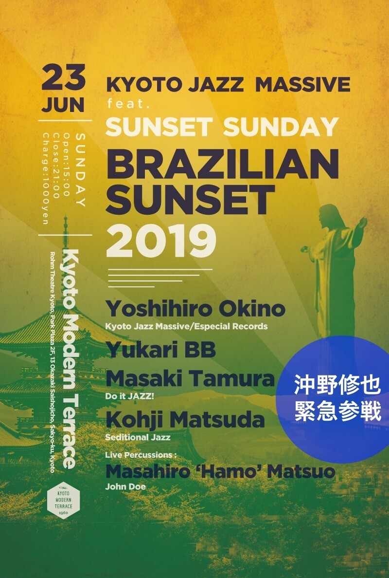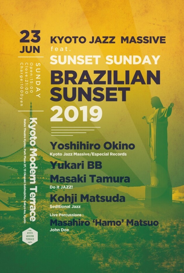 人気ゲスト・ハウスLen、バーバー兼バーガー・ショップBurlesque、ビアパブ Crafthouse Kyotoでの開催を経て、今回は4月に続きKyoto Modern Terraceにて今年2度目の開催が決定。今回は日曜という事で久々の”Sunset Sunday”!それも昨年好評だったブラジル縛りでの-Brazilian Sunset-を行います!更にライヴ・パーカッションもフィーチャーし、Samba, Bossa Nova, MPB, Brazilian Fusion等100%ブラジル選曲で挑みます!