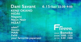 古民家を改装した、ディープで高音質な人気スポットBonoboにて、定期開催中のFreeee。今回は、VENTの人気テクノパーティー「MIND OFF」のDani Savant、IBIZA-東京を股にかける人気パーティー「SUNNY」の人気DJ KENJI OKANO、コアな野外テクノパーティーフリークから絶大な信頼をうける「Paramount / OTODASHI」のHIDAIがゲストとして登場。