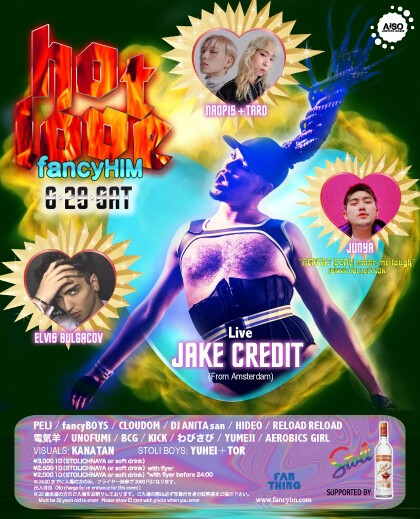 アムステルダムで、いまもっともアツいアーティストをいち早くファンシーヒムに招待!エレクトロヒップホップバンド”FATA BOOM”でも活躍する、ジェンダー・ポップアーティストのジェイク・クレジット、彼の迫力のライブをお見逃しなく!また新進気鋭のデザイナーJUNYAの”HENTAI PLAY make me laugh”コレクションの魅力をお届け!ジュンヤボーイズ達がパーティーを盛り上げます。そして各メディアでも注目のNAOPIS+TAROも参戦!この夏、一番ホットなラブナイト!