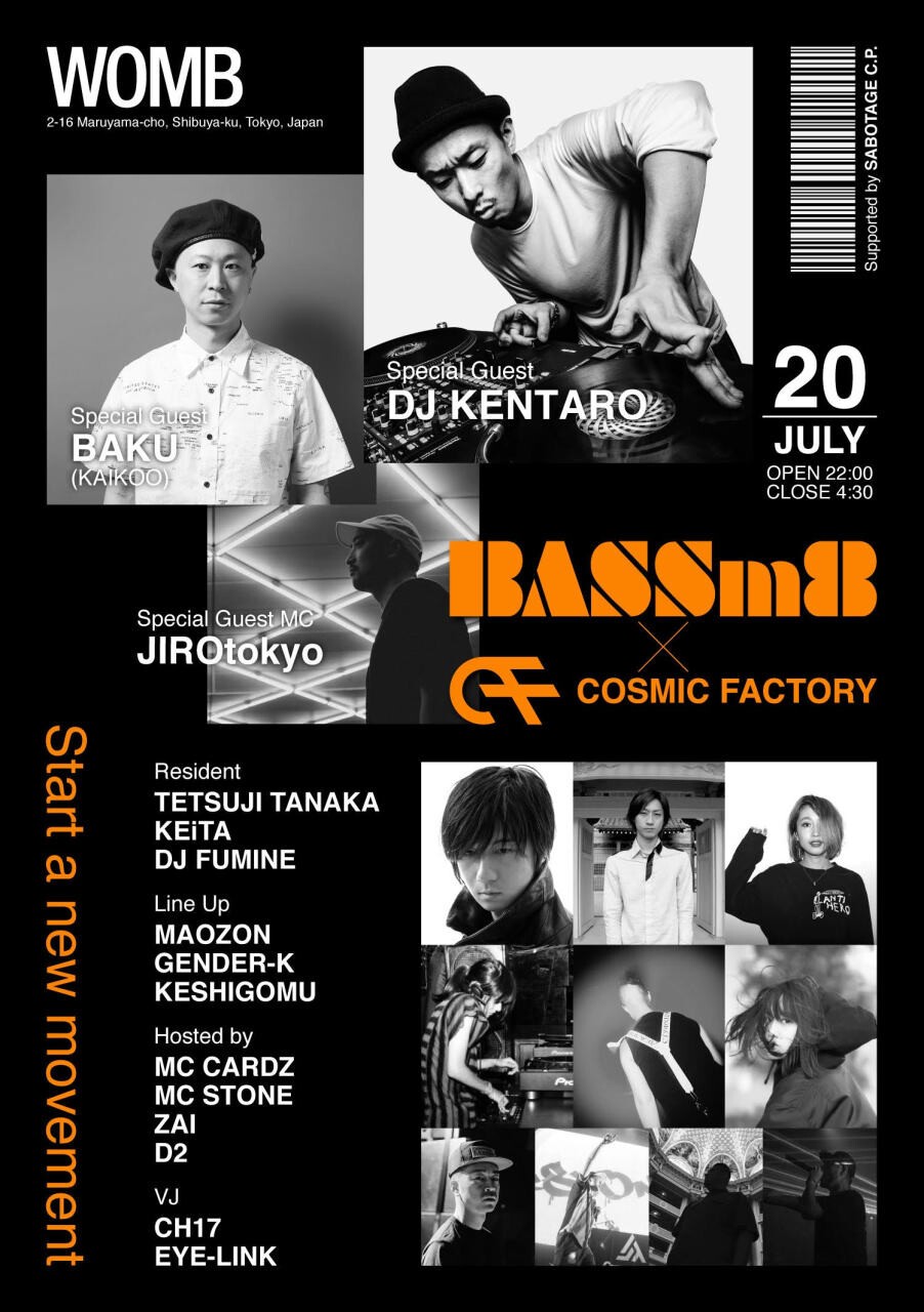 めまぐるしく流行が移りゆく現在のダンスミュージックシーンの中、イギリスを発祥とする唯一無二の音楽ドラムンベース。今もなおその重低音と高速で駆け抜けるビートに魅了され世界中にヘッズの絶えないこの音楽の魅力をより多くの人に届けるため、シーンの未来を導くパーティー ”BASSm8" の WOMB レギュラーが COSMIC FACTORY とのコラボで、7月第3土曜に 1DJ1MC の日本を代表するアクトが集結したドラムンベース祭典を開催!