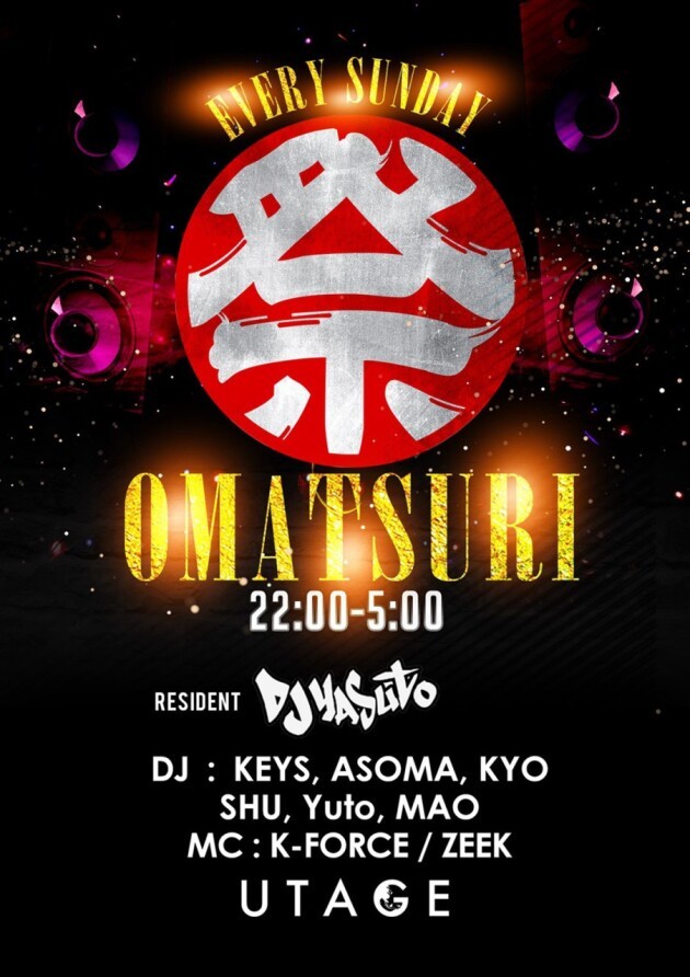「日曜日はオシャレに楽しく!!」をコンセプトに美容系・アパレル系の方は入場無料のイベントを毎週開催しています。UTAGEらしいALL MIXで朝まで盛大に盛り上げます。