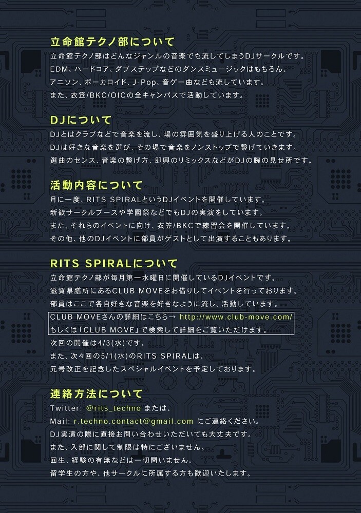 立命館テクノ部(DJ サークル)による2002年5月よりスタートし18年目に向けて始動した老舗イベント。