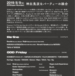 Contactフロアはtite-lineのレジデントDJ Koudaiを中心に、国内産のディープな個性が際立つサウンド探究者が集結。またFoyerフロアではODD Fridayクルーが総出演し、音/映像/アート/食と多目的な場所を提示する。