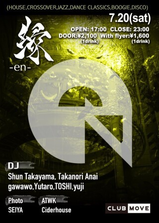 縁-en-は、CLUBや音楽が好きな方は勿論、CLUBに来たことが無い方にも楽しんでもらえる非日常空間を演出し、年齢や環境、仕事などの垣根を超えて、出会い、繋がり、楽しいひと時を過ごすイベントです。