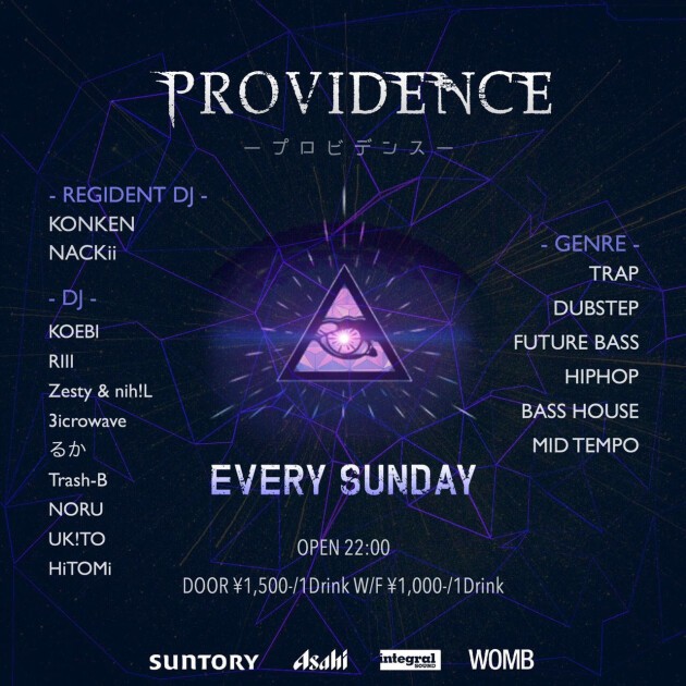 日曜日の夜に、東京のナイトライフに現れた世界基準の新感覚パーティーが開かれる。もはや世界標準の HIP HOP から派生した TRAP、FUTURE BASS や新定番の BASS HOUSE、FUTURE HOUSE など BASS MUSIC を中心に世界のトレンドを同じスピードで体感できる唯一無二のイベント、PROVIDENCE。このイベントに導かれた貴方は既存のクラブに物足りないと感じていた何かが見つかる。エッジ―な選曲、ファッショナブルなオーディエンス、華やかなコミュニティー。この PROVIDENCE が東京のナイトライフの新定番になる日もそう遠くない。