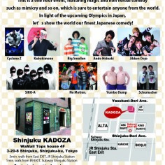 「新宿コメディクラブ」とは「アメリカズ・ゴット・タレント」を始め、世界中のタレントショー ステージで活躍している日本人コメディアンで結成されました。 ノンバーバル、マジック、モノマネなどなど、世界中の誰が見ても、楽しめる1時間のコメディ イベントです。2020 年のオリンピックに向けて!!ジャパニーズコメディ!!とどけ世界へ!!!