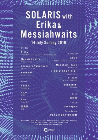 テクノの新たな未来を切り開く事をテーマにしたパーティSOLARISを初開催。初回となる今回は、デトロイトの名門エレクトロ・テクノ・レーベル〈Interdimensional Transmissions〉の中心的存在であり、自身のラジオが16周年を迎えるなど多方面で活躍するデトロイトの才女Erikaが登場する。活発なリリースで目下注目のソウル拠点のプロデューサー、Messiahwaitsと共に彩る。国内からは、ディープレーベル〈Informa〉などからリリースを続けてきたHironori Takahashiと東京拠点のテクノパーティKatharsis主催のkannabiが登場。
