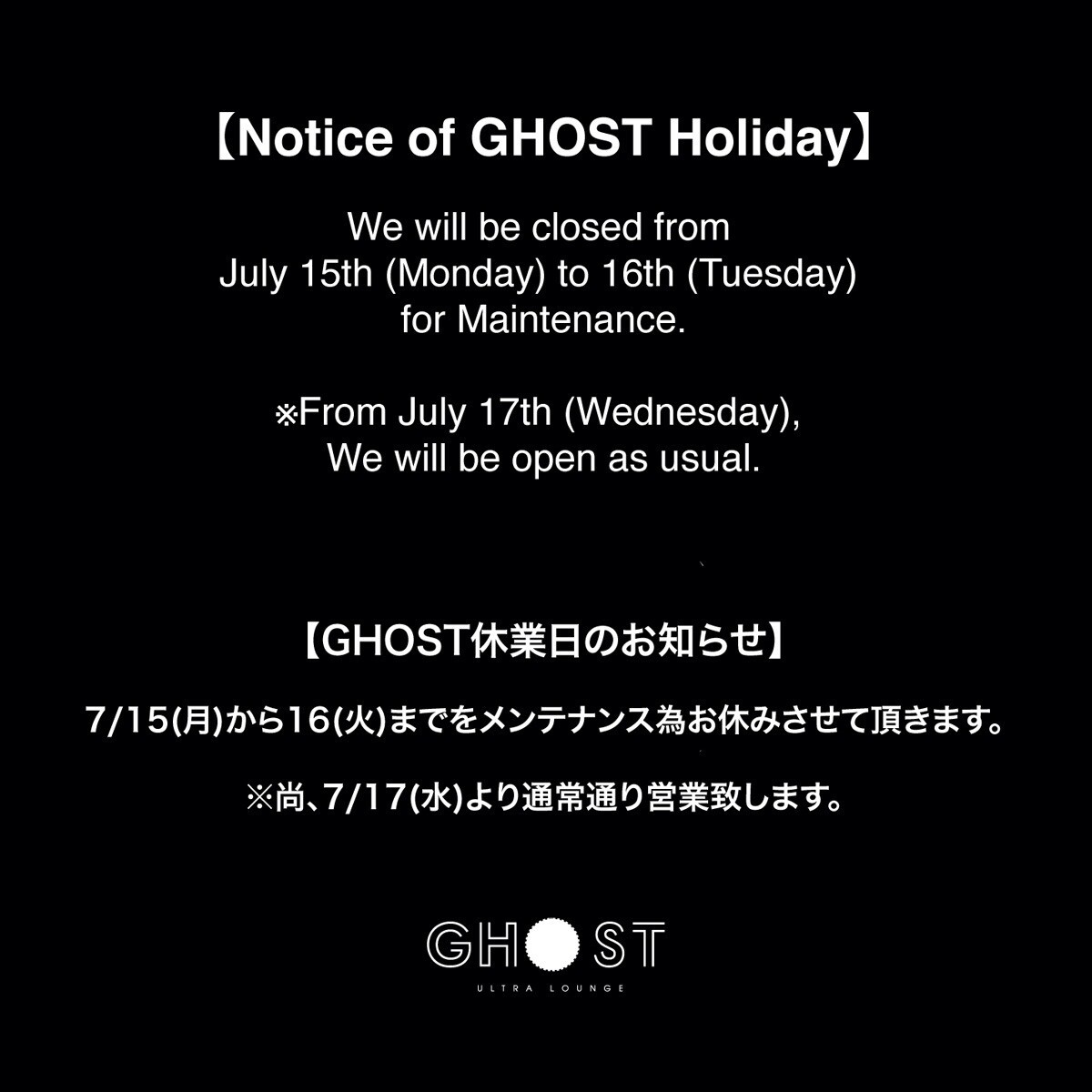 【GHOST休業日のお知らせ】