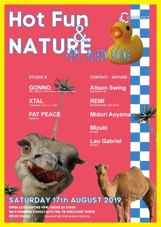 2019年、真夏の一夜にHot FunとNATUREと題したふたつのパーティがContactで合同開催。Studio Xフロアには、日本が誇るエレクトロニックミュージック・アーティストGonnoが登場。ハウス/テクノ/アシッドなど、新旧のトラックを自由自在に遊泳するDJセットで渋谷の夜をアツく盛り上げる。さらに、GonnoとのコラボレーションでもおなじみのXTALも参戦。しばしの充電期間を経てDJ活動を再開したばかりの彼が一体どんなプレイを聞かせてくれるのか? 艶やかにフロアを演出するXTALのセットで踊り明かしたことがある人ならば、この機会は絶対に逃すべからず! Contactフロアではベルリン在住のアメリカ人DJ、Alison Swingが、往年のシカゴハウスを彷彿とさせるトラックにモダンなエッセンスを散りばめながら妖艶な空間を創り上げる予定だ。それを受けて東京屈指のシカゴハウス番長REMIが、一夜の物語をどう紡ぐのかも要注目!