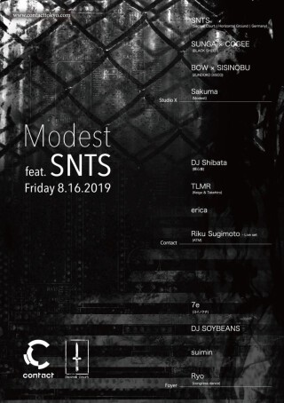 現行のテクノシーンで目下注目を集めている覆面プロデューサーSNTSを召喚する。ドイツ出身の男性であること以外、素性が謎に包まれているSNTSは、同名のセルフレーベル〈SNTS〉と〈Sacred Court〉から作品の大半を発表しているほか、〈Horizontal Ground〉〈Edit Select〉〈Horo〉といった主要レーベルからも暗鬱とした重々しいトラックを宣布しながら自身のサウンドを打ち立ててきた。漆黒の闇にリズムがとどろくSNTSの一貫したトラックは、近年のテクノ作品のなかで怪しくも刺激的な魅力を放っている。そんな密教世界を喚起するSNTSによる魅惑のサウンドジャーニーが、週末初開催となるModestを怪しく染め上げる! 共演にはもちろん、Modestの発起人Sakumaも参加。DJ Nobu、Marco Shuttle、Rroseといったアーティストのサポートアクトをつうじて頭角を現している彼のDJにも注目だ。