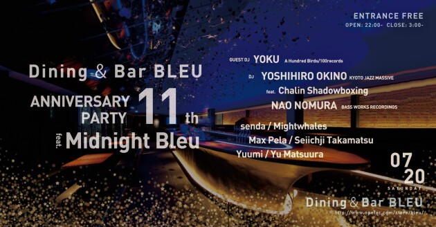 2008年7月に道頓堀リバーサイドにオープンしたDining&Bar BLEU (ダイニングバー ブルー) 11周年を記念したスペシャルパーティーを開催。この記念すべきパーティーをホストするのはKYOTO JAZZ MASSIVEのYOSHIHIRO OKINOとBWRのNAO NOMURAがお届けする夜を彩るパーティー"MIDNIGHT BLEU"。GUEST DJにはA Hundred BirdsよりYOKUが登場。そして、大阪を拠点に様々なシーンで活躍するDJが出演する。