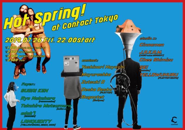 ここはまるで桃源郷!? 令和最初の夏をゆるりと過ごす極楽空間がContactに出現! BPM120~140のダンスミュージックが巷にあふれているが、もっとゆったりとしたテンポでとびきりハマれる音楽がこの世に存在することを忘れてはならない。ここHOT SPRINGでは、レフトフィールド/トライバル/ディスコ、さらにはカテゴライズ不可能な摩訶不思議トラックなど、一夜をつうじて多彩なサウンドが展開し、意識を心地よく異世界へと誘う。