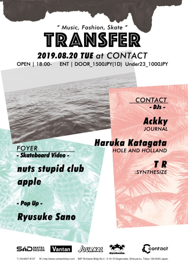 Contactフロアではスケートカルチャーと深い繋がりをもった3名の実力派DJ、ackky、Haruka Katagata、TRの特別なグルーヴがうねる。そしてFoyerフロアでは、前回好評を博した若手クルーNuts Stupid Clubに加え、今回初参加となるappleによるスケートボードビデオのプレミア試写会を開催する。