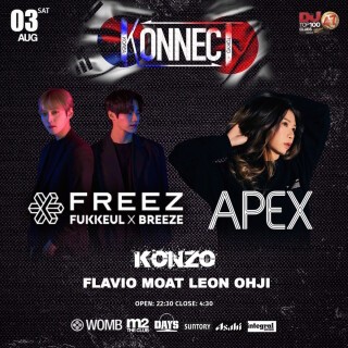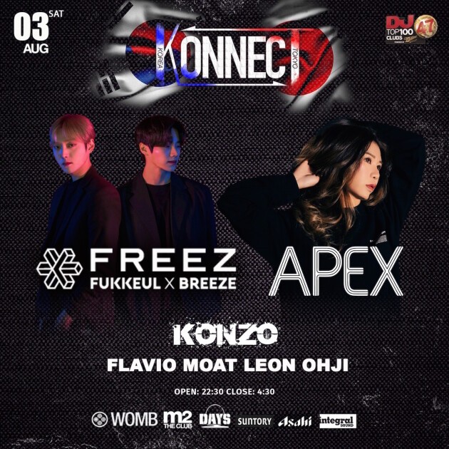 日本初の韓国音楽空間 KONNECT 第7弾が SUMMER SPECIAL として2週連続での開催が決定!今回、GUEST DJ に韓国ソウルにある CLUB MADE のレジデントでもあり圧倒的な人気と実力を兼ね揃え、4月の KONNECT にも出演した FREEZ に加え、同じく韓国ソウルの M2 のレジデントで、長年韓国シーンを牽引してる DJ APEX の2組の出演が決定! VIP LOUNGE には TECHNO、HOUSE ZONE として都内屈指の DJ が登場!また、毎回大盛り上がりの K-POP ZONE もあり韓国好きな方なら誰でも楽しめるコンテンツも必見!韓国の CLUB、K-POP、K-HIP HOP の全てが一夜に楽しめる KONNECT に 沢山のご来場をお待ちしております!