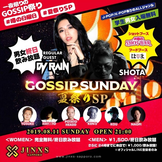 全国各地で活動する人気フィメールDJ『RAIN』をゲストに迎える毎週日曜日開催『GOSSIP SUNDAY』が 夏祭りEDTIONとなり店内はお祭りにモードに大変身!