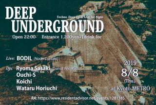 Currently he is playing in an underground techno/house party『Connected Underground』,『Deep Underground』,『yelltail』, all held in "Kyoto Metro" that is legendary night club in this historical city.
