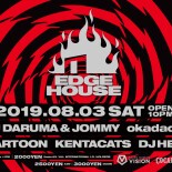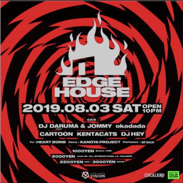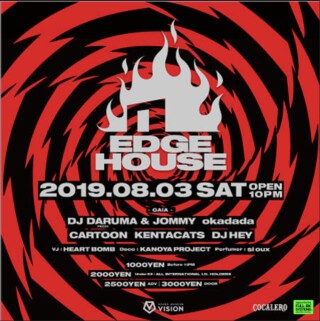 EDGE HOUSEは、世界的なトレンドである現在進行形のHOUSE / TECH HOUSEを軸に、国内外より ”エッジの効いた” ゲストを迎え、レジデントのDJ DARUMA(PKCZ®)&JOMMYを筆頭に各レジデントDJたちが最新のハウスグルーヴでフロアを盛り上げています。