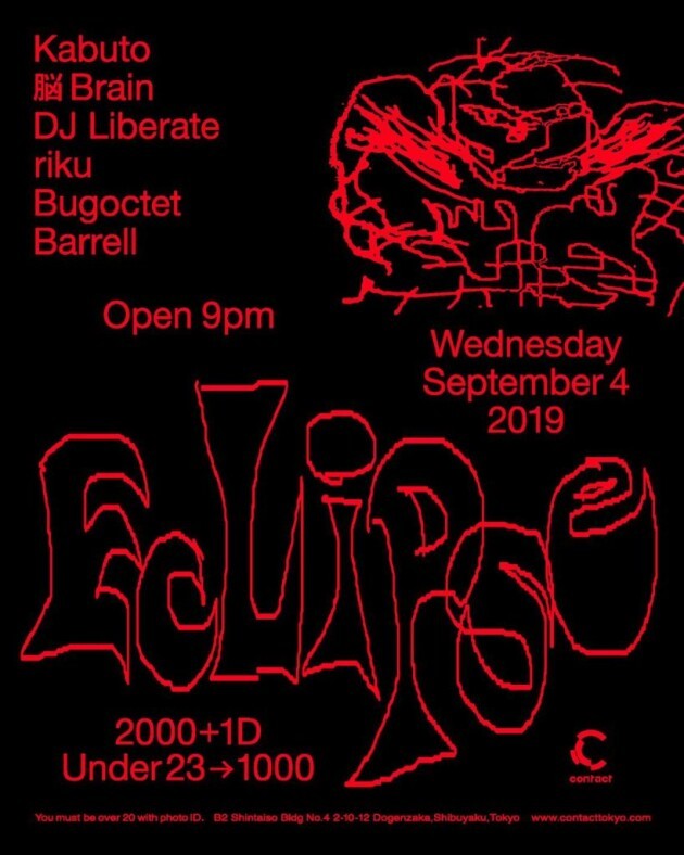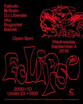 一晩に散りばめられた多様な音の衝突にフォーカスを当て、その消失点を探り続ける新興パーティEclipse。今回はDAZE OF PHAZEを主催し、ミニマルでソリッドなグルーヴを操り聴くものを陶酔へと導くKABUTO、重くアブストラクトなビートを脳髄まで響かすDJ Liberate、瞬間的なエネルギーをライヴ的にパッケージしてみせる脳BRAINの3人をゲストに迎える。ホストを務めるBugoctet、riku、Barrellを含めた6人が織りなす異種格闘技的なストーリーテリングが、平日のContactフロアを贅沢で刺激的な空間にすることは間違いないだろう。