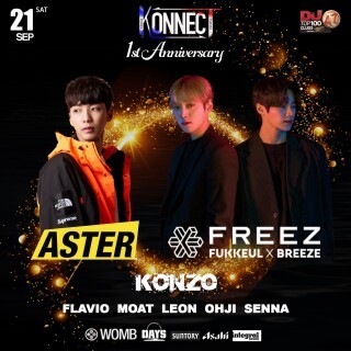 初回去年10月に開催された KONNECT から早1年、今回の KONNECT はなんと 1st Anniversary Special という事で、ゲストに皆様が待ちに待った ASTER を迎え、1周年記念パーティーを行います!またこの度 KONNECT RESIDENT DJ となった FREEZ の2人も参戦し、韓国メンズ DJ 人気 TOP2 が日本東京渋谷 WOMB に揃います。更に1周年を記念して、記念グッズを製作予定ですので、そちらもお楽しみにしてください!