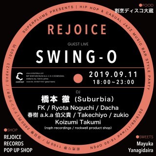 Rejoiceは選曲家 橋本徹、Nujabesのマネージャーやレーべルマネージメントを務め、現在は〈roph recordings〉をマネージメントするKoizumi Takumi、〈Hydeout Productions〉の旗艦店〈Tribe/Guinness Records〉からリリースし、同店のスタッフでもあるFKを中心に、腕利きのセレクターが音楽を担当する。“等身大かつ自分達にとってリアルなジャズやヒップホップ”、“本当に音楽を愛する人たちが安心して和める場所”をコンセプトに掲げ、ジャズ&ヒップホップを中心に良質な音楽を気ままに楽しめるイベント。