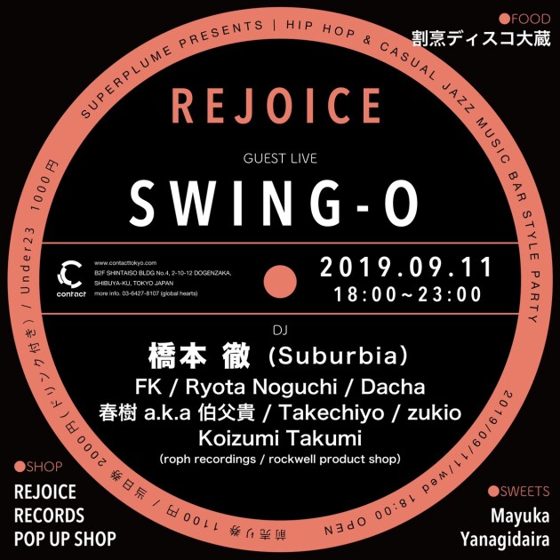 “Rejoice” will be joined by selectors Tohru Hashimoto, Roph Recordings’ label manager Koizumi Takumi (former manager of Nujabes), Hydeout Productions’ flagship shop “Tribe (+Guinness Records)” manager FK who has released from the same label. An evening for true music lovers brought to you by true selectors of Jazz and Hip Hop.