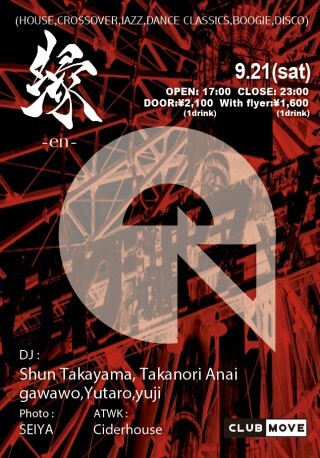 縁-en-は、CLUBや音楽が好きな方は勿論、CLUBに来たことが無い方にも楽しんでもらえる非日常空間を演出し、年齢や環境、仕事などの垣根を超えて、出会い、繋がり、楽しいひと時を過ごすイベントです。