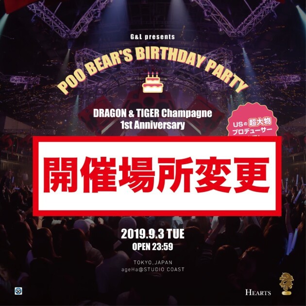 誠に勝手ではございますが、本日ageHa@STUDIO COASTにて開催を予定しておりました”POOBEAR'S BIRTHDAY PARTY”は主催者側の都合により下記会場に開催場所を変更する事となりました。